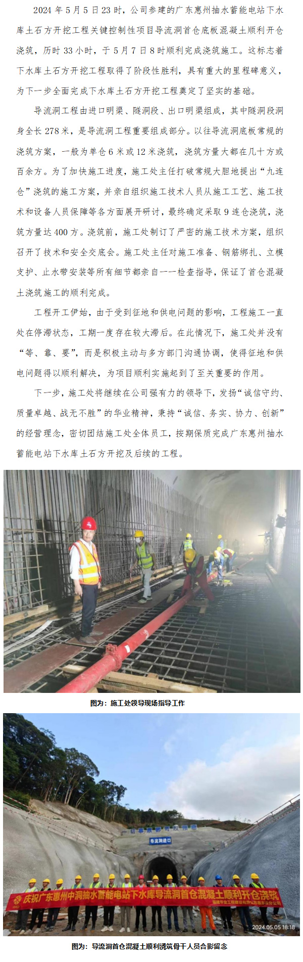 广东惠州中洞抽水蓄能电站导流洞首仓混凝土成功浇筑完成
