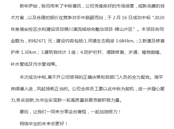 热烈祝贺我司成功中标“2020年泉港安控区水利建设项目锦川溪流域综合整治项目-锦山片区”